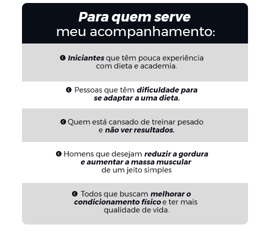 O meu acompanhamento foi planejado para que você consiga alcançar a melhor versão do seu corpo, independente do seu condicionamento ou do seu objetivo.